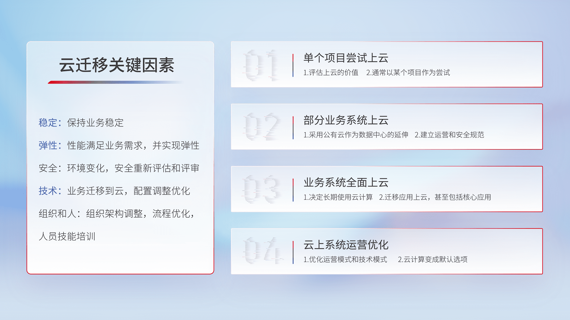 结合实际业务,,,从规划设计、、、云平台选型、、、云原生改造、、、数据迁移、、集成交付,,,迁移全过程为客户识别最佳上云路径,,,做好风险识别管理,,,,设计网络架构、、、身份权限、、、安全审计合规、、、操作审计、、、、日志审计、、监控告警策略、、、、多站点容灾设计等,,,,对云上基础设施进行整体规划,,,,提升IT治理水平,,,以满足弹性、、、、高可用、、高性能的需求。。。