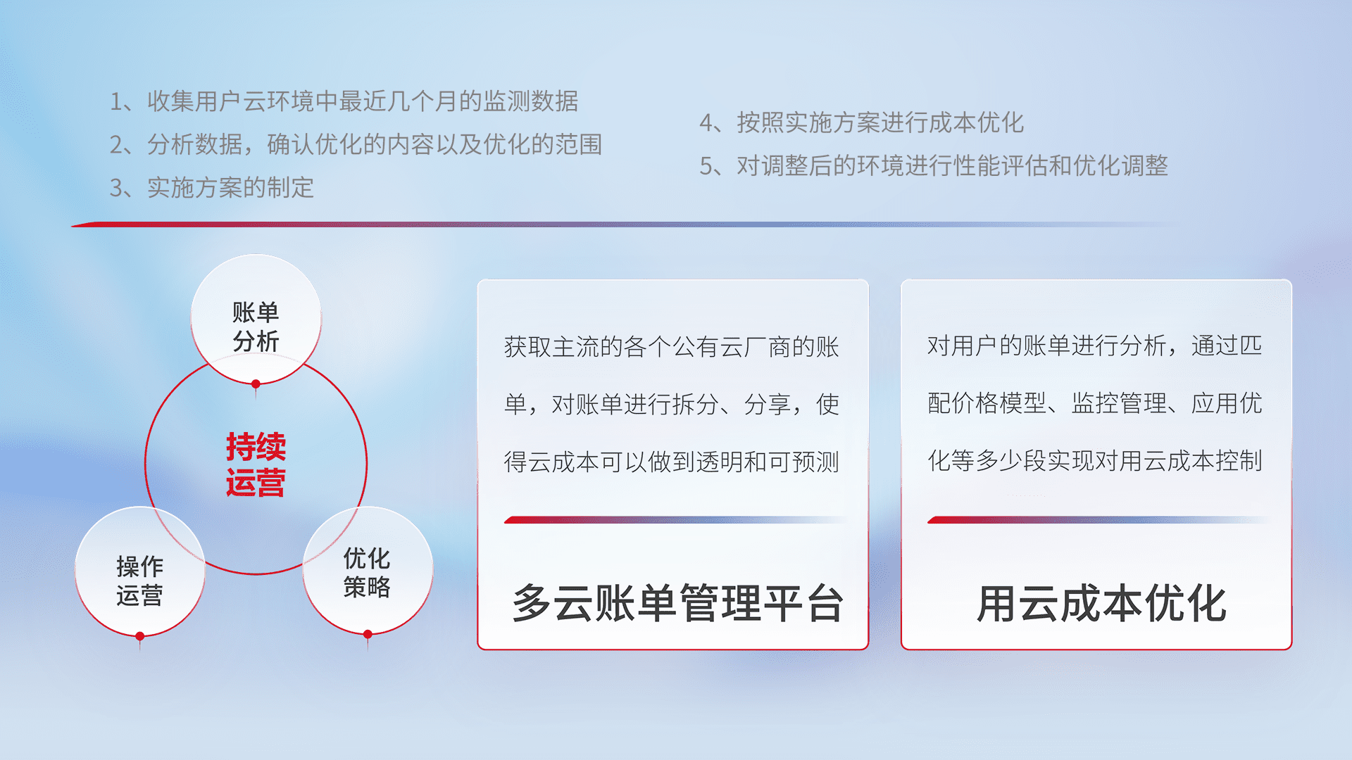 通过多云纳管,,,,以统一的资源数据模型把客户的云资源进行抽象和封装,,,进而实现对多云资源的统一操作,,,,保障云资源管理的可靠性、、、稳定性与可用性。。。量身定制化运维内容,,配置、、、、开发运维、、、补丁管理、、备份、、、、监控、、、认证和访问管理、、审计和日常巡检等,,保障在用云过程中的可靠度,,,,稳定度以及高可用率。。